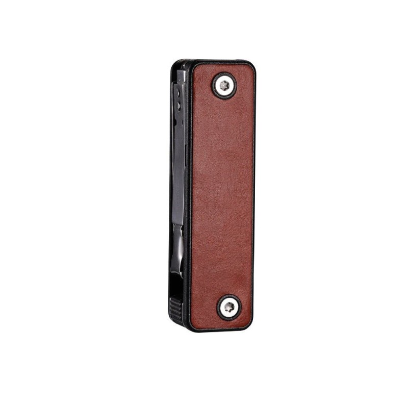 Рукоятка изготовлена из АБС-пластика с кожаными вставками — это определенно добавляет ножу стиля и солидности. Каждый инструмент оснащен функцией блокировки. Детали надежно закреплены в корпусе, что делает использование мультитула удобным и безопасным: чтобы достать нужный инструмент, просто нажмите на кнопку и выдвиньте деталь.Длина лезвия 53 мм.