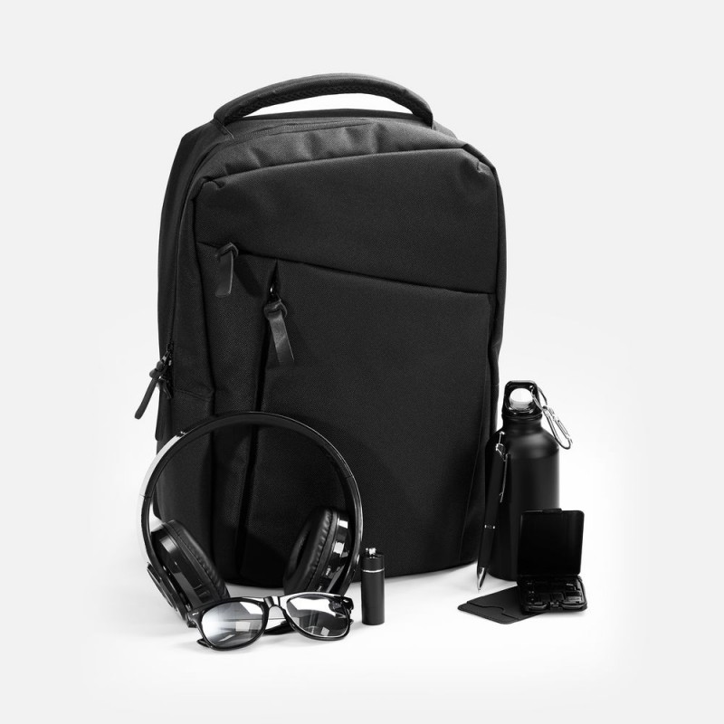 В нем собраны 8 продуманных и полезных аксессуаров в элегантном черном исполнении: рюкзак для ноутбука, беспроводные наушники, органайзер с беспроводной зарядкой и набором адаптеров, бутылка для воды, чехол для карты на телефон, солнцезащитные очки, брелок-фонарик и шариковая ручка с покрытием софт-тач. В такой компании получится эффективно организовать рабочее время и пространство, а также подчеркнуть деловой статус в любой ситуации.