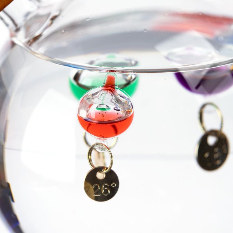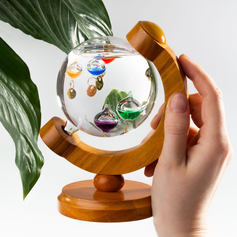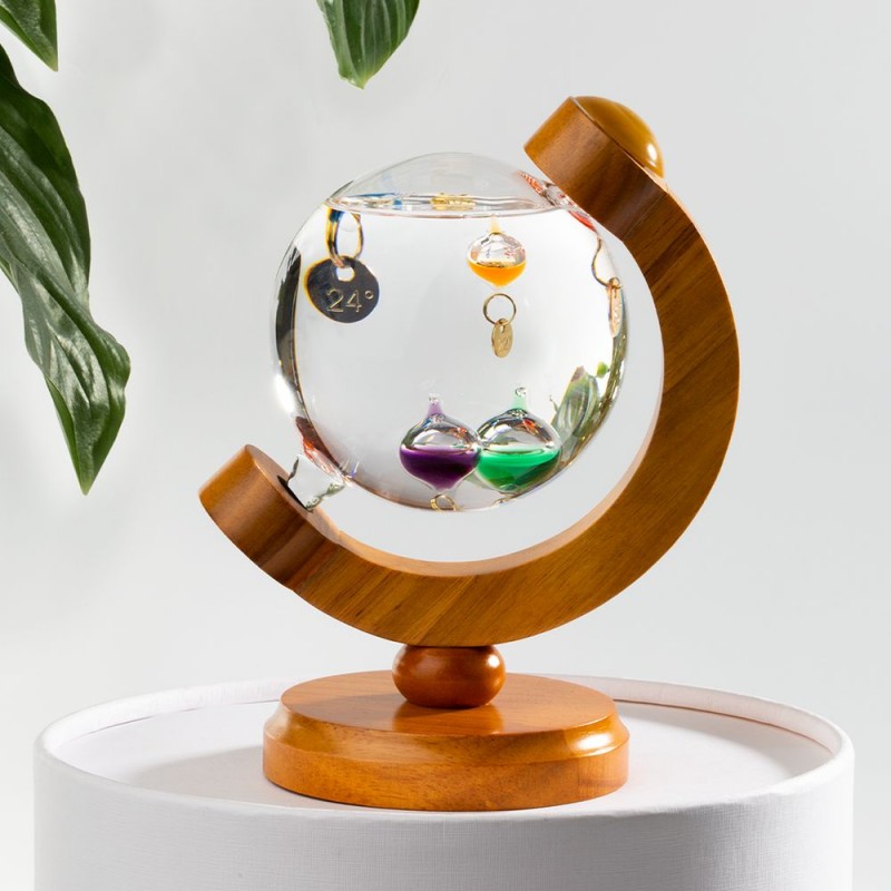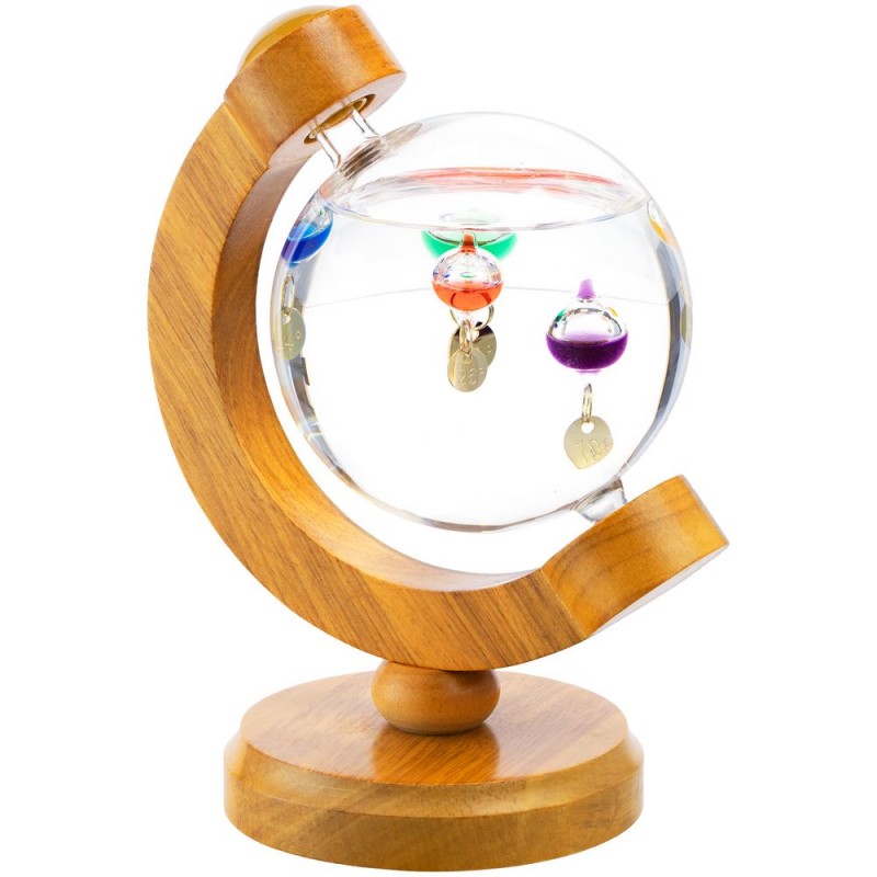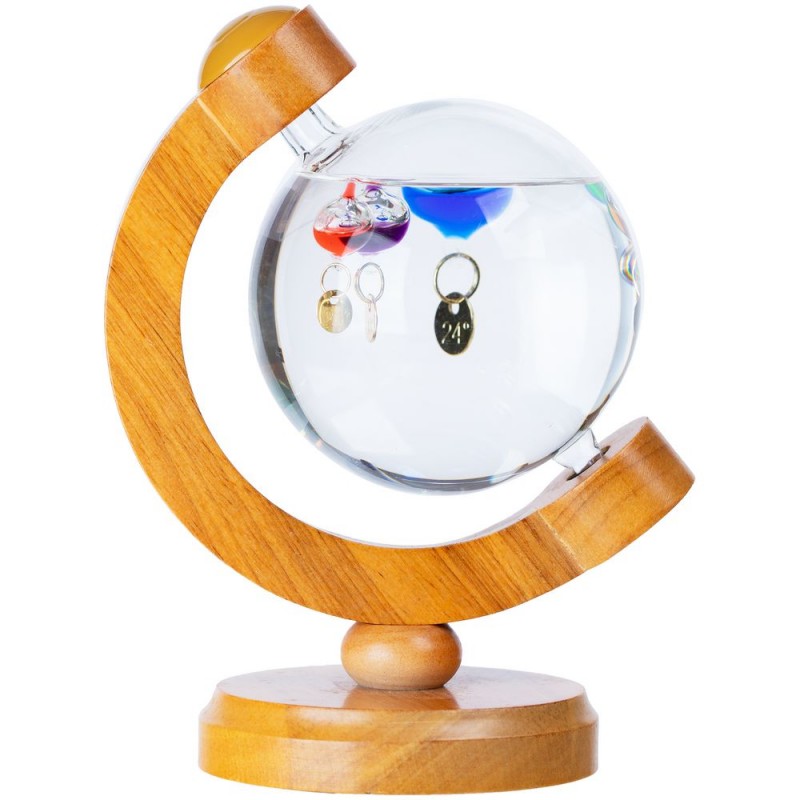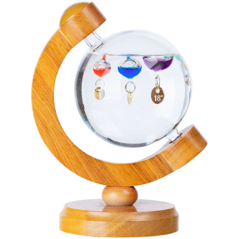 Термометр Галилео оригинальной формы, напоминающей глобус, добавит индивидуальности домашнему или офисному интерьеру. В основе его работы лежит физическая закономерность, впервые отмеченная великим Галилео Галилеем: плотность жидкости увеличивается при снижении температуры и уменьшается при ее повышении. И теперь стеклянные шарики в жидком парафине не только радуют глаз, но и позволяют с легкостью определить температуру в помещении.