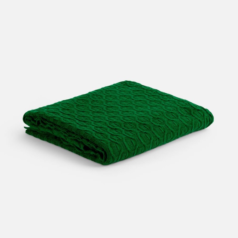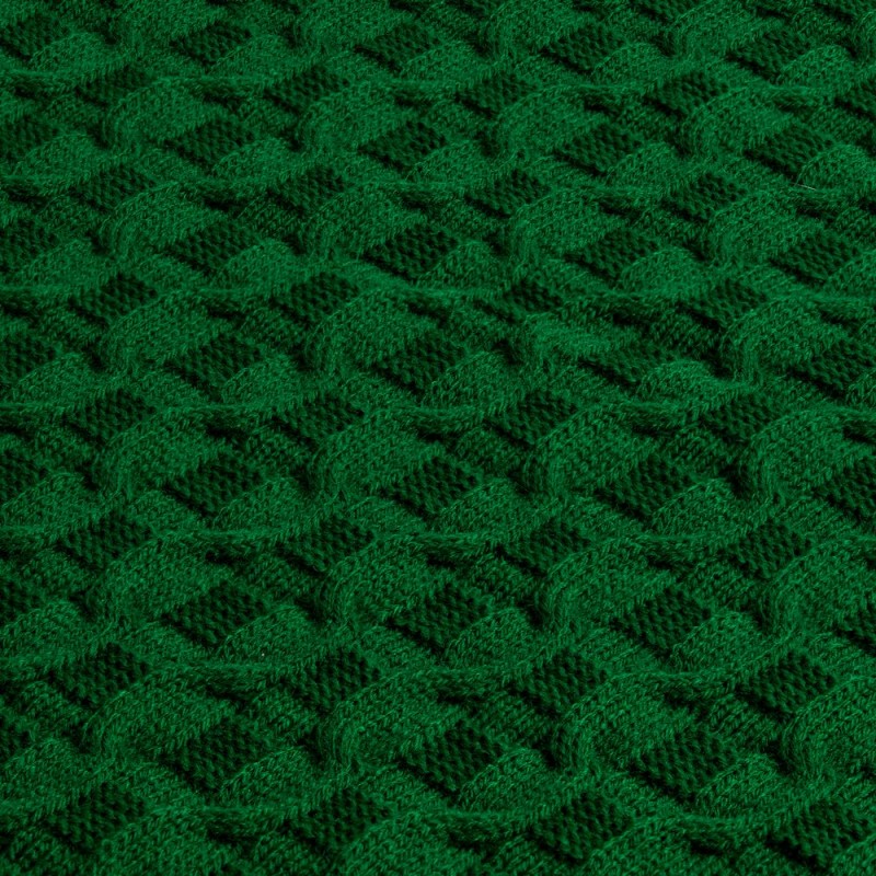 Модель: однотонный плед с фактурной вязкой, которая позволяет сделать его воздушным и объемным. Чередуя различные типы петель на гладком полотне, можно вывязать любую графику — логотип, текст, товарный знак.