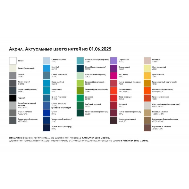 Цвет: выберите цветовое решение (2 цвета) по таблице «Актуальные цвета нитей» (на фото).