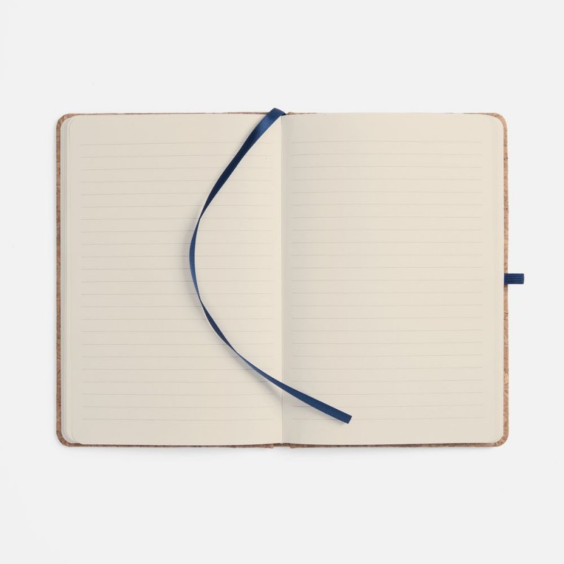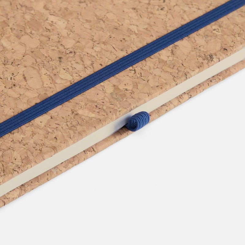 Блокнот в твердой обложке из натуральной неокрашенной пробки, дополнен цветными петлей-резинкой для ручки, ляссе и резинкой на обложку.