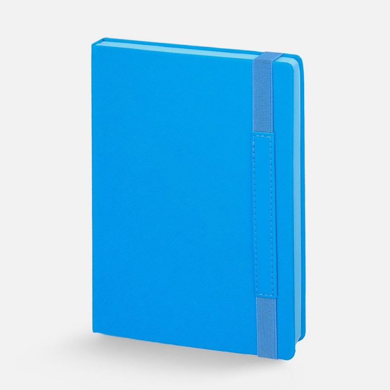 Ежедневник с твердой обложкой, выполнен из материала Nice Touch, голубой JJ, дополнен резинкой с шильдой из материала Soft Touch Ultra и ляссе в цвет обложки.