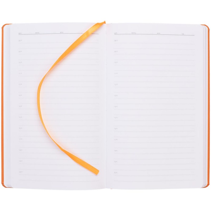 Ежедневник с твердой обложкой, выполнен из материала Canyon, оранжевый ОО, дополнен ляссе в цвет обложки.