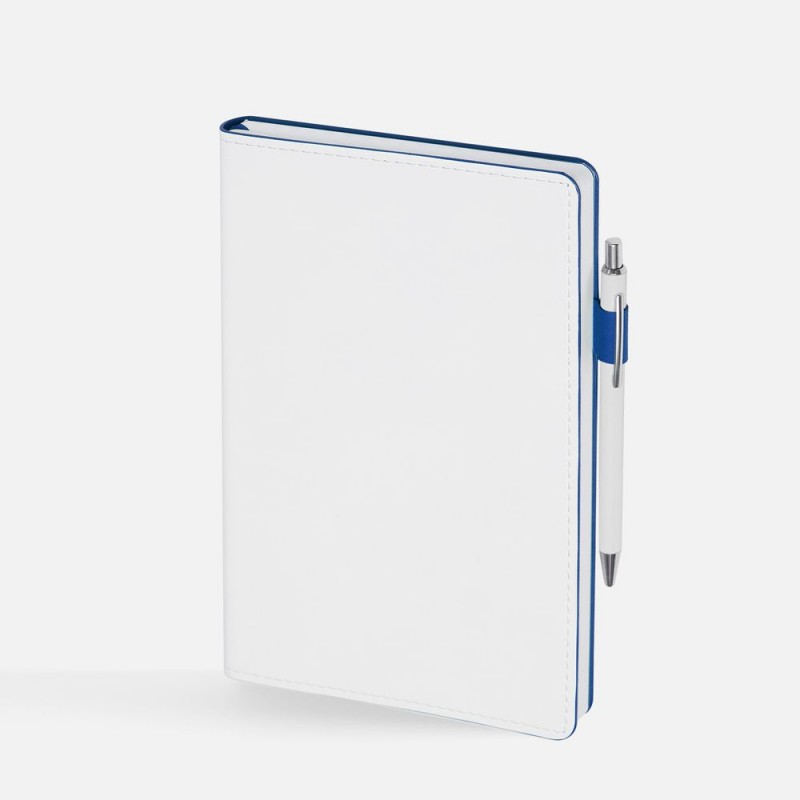 Гибкая обложка, материал обложки — Soft Touch, белый BB и Latte, синий НН; материал петли для ручки — Nice Touch, синий НН. Срез обложки окрашен в синий цвет.