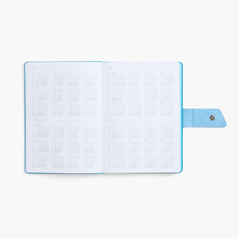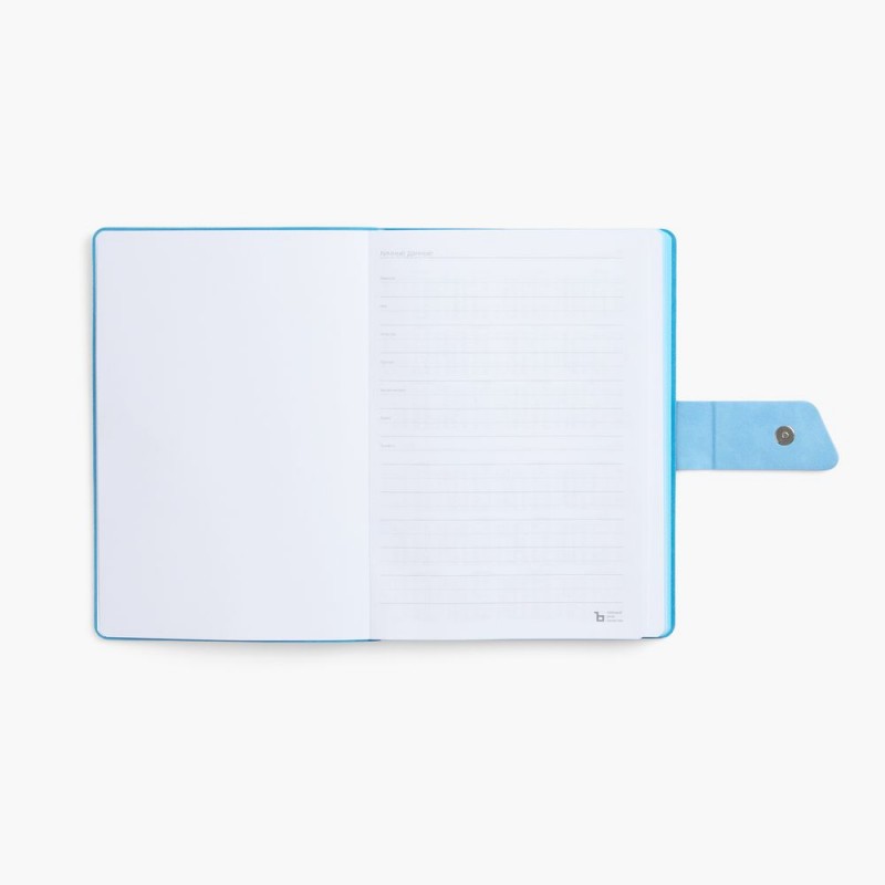 Ежедневник с гибкой обложкой, выполнен из материала La Fite, черный АА и Nubuck Touch, голубой, дополнен голубым ляссе и хлястиком на кнопке.