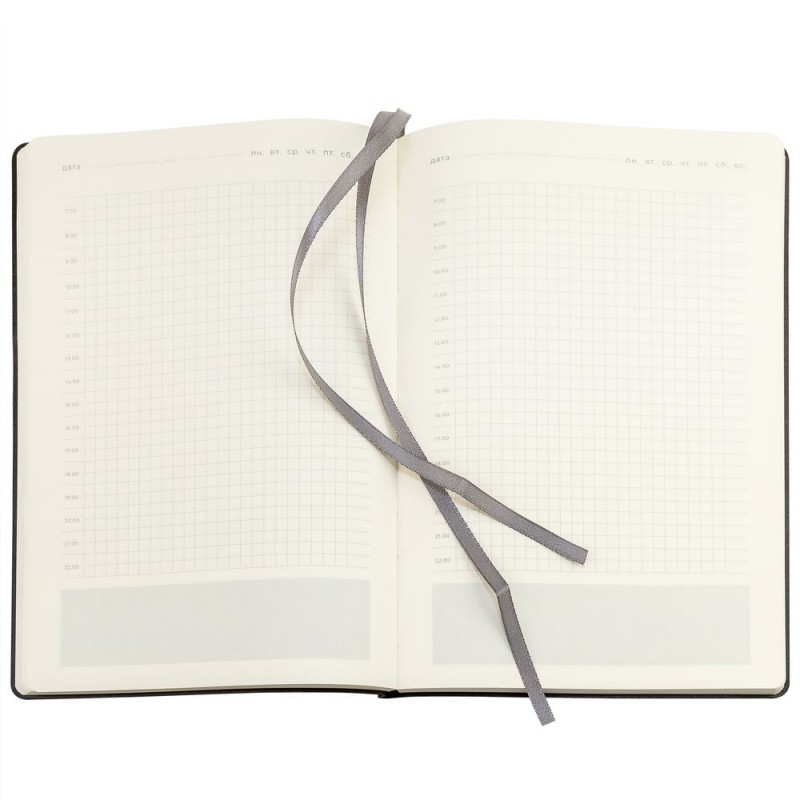 Ежедневник 17х24 см, с гибкой обложкой, выполнен из материала Nubuck Touch, темно-серый ЕЕ, дополнен петлей-лейблом для ручки и двойным ляссе в цвет материала.