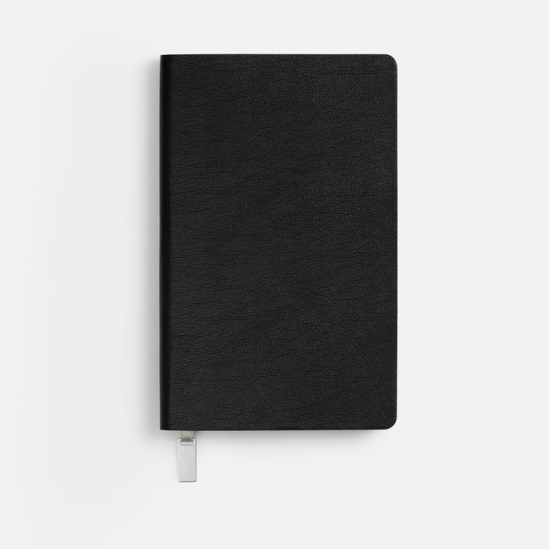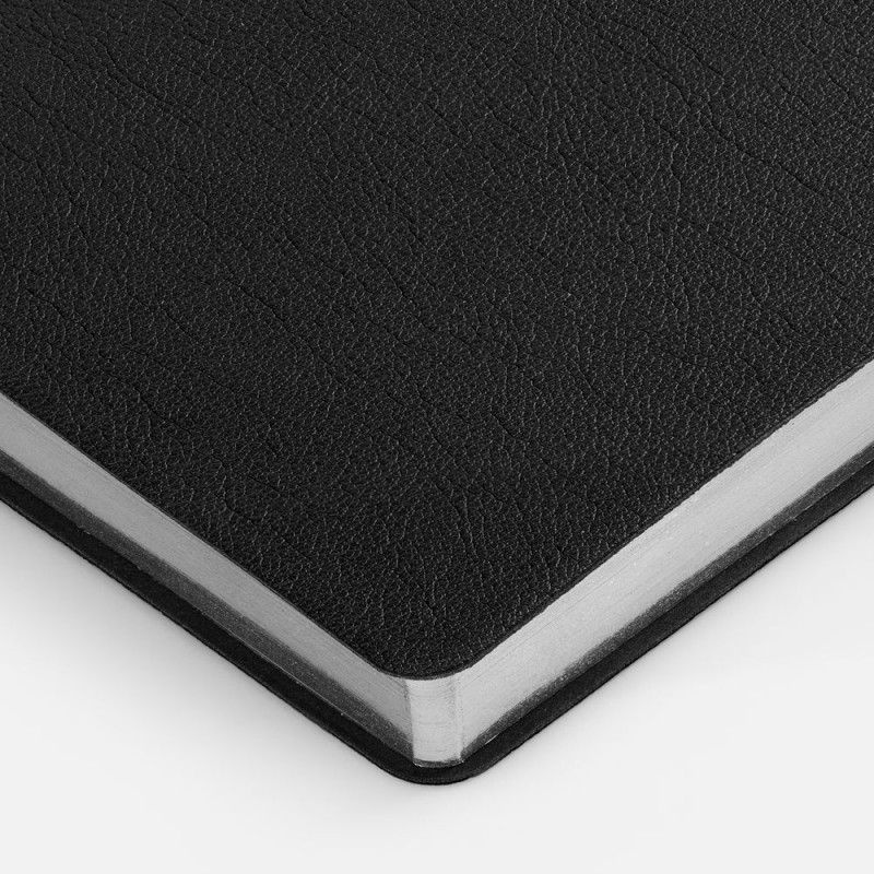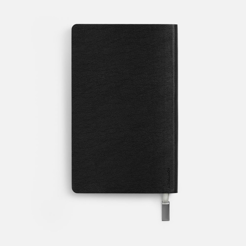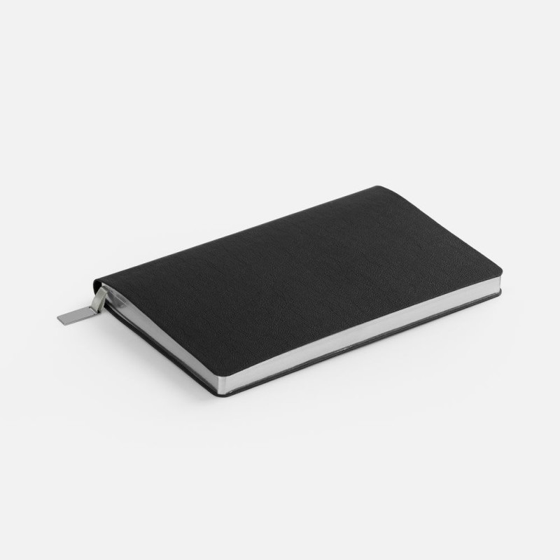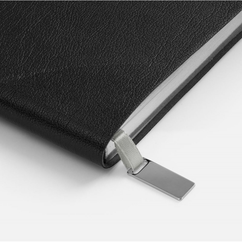Ежедневник с гибкой обложкой, выполнен из материала Petrus, черный АА, дополнен серым ляссе с металлическим шильдиком.