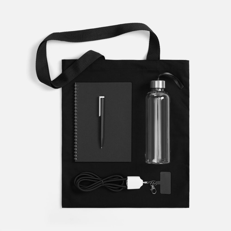 - Материал:сумка - хлопок, 240 г/м²; ручки - полиэстер; кабель-ланьярд - нейлон, пластик; металл; бутылка - пластик, пищевой; крышка - металл, пластик; блокнот - бумага, картон; ручка - пластик