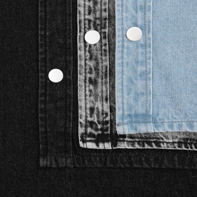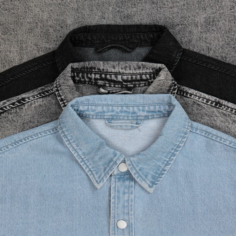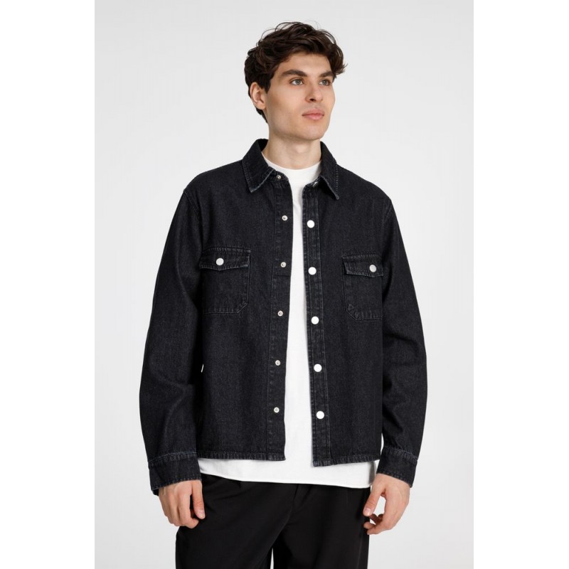 Джинсовая куртка-рубашка унисекс на кнопках прямого силуэта.
