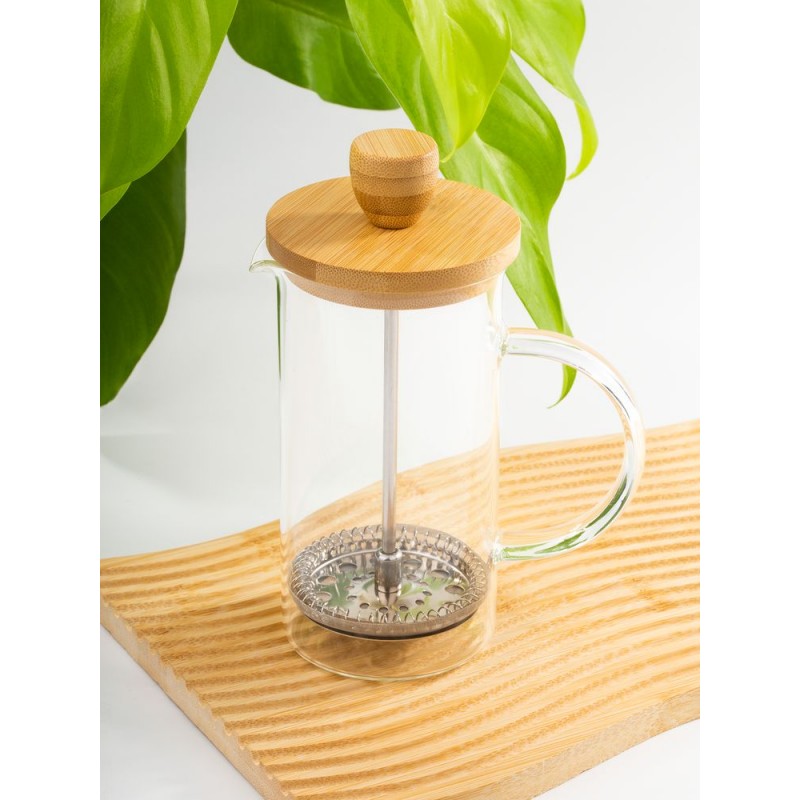 Френч-пресс с изящным сочетанием прозрачного боросиликатного стекла и натурального дерева станет стильным акцентом на кухне.