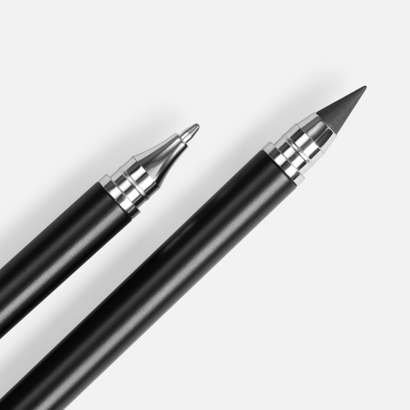 Изготовленный из сплава графита со свинцом долговечный наконечник карандаша не требует заточки, а закончившийся стержень в ручке легко заменить. Оба наконечника закрываются защитными колпачками.