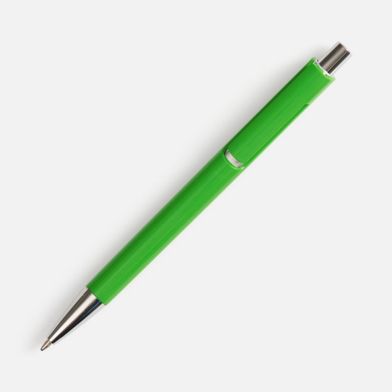 Шариковая ручка с цветным глянцевым корпусом и акцентными серебристыми деталями.