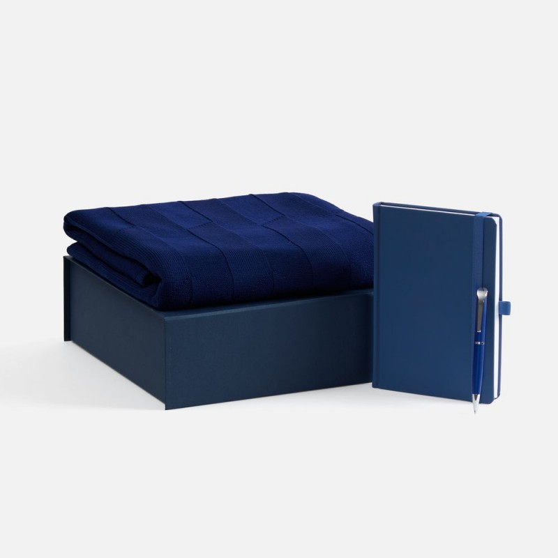 Однотонный набор с основной канцелярией и пледом — классика жанра в уютном исполнении. С компактным ежедневником будет удобно делать заметки в любое время — благодаря петельке для ручки любимый пишущий инструмент будет всегда под рукой. А изысканный акриловый плед с геометрическим узором позволит выразить самые теплые пожелания и ддобавит плавных линий в интерьер.