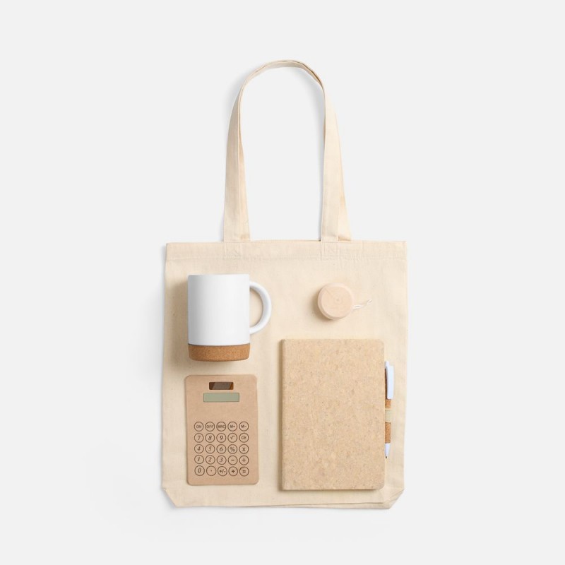 - Материал:блокнот - пробка; кружка - каменная керамика, подставка - пробка; калькулятор - картон; сумка - хлопок 100%, плотность 210 г/м²; саржа; игрушка-антистресс - дерево; ручка - пластик, пробка