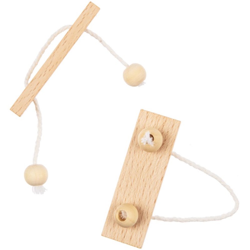 Миниатюрная головоломка Combi из натуральных материалов. Задача головоломки — разъединить ее элементы, не развязывая веревку.