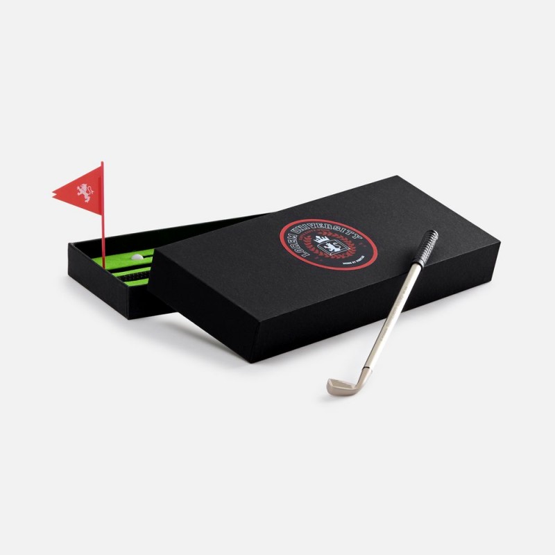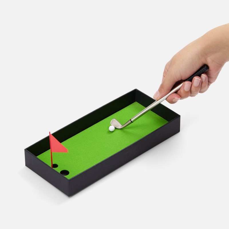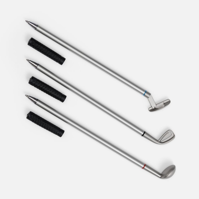 В комплекте: 3 клюшки-ручки со сменным стержнем с синими, черными и красными чернилами, 2 мячика для гольфа, флажок и подарочная коробка.Не является детской игрушкой. Не предназначено для детей!