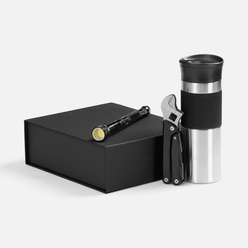 мультитул - нержавеющая сталь; алюминий; термостакан - нержавеющая сталь; фонарь - алюминий, металл; коробка - переплетный картон, бумага Malmero