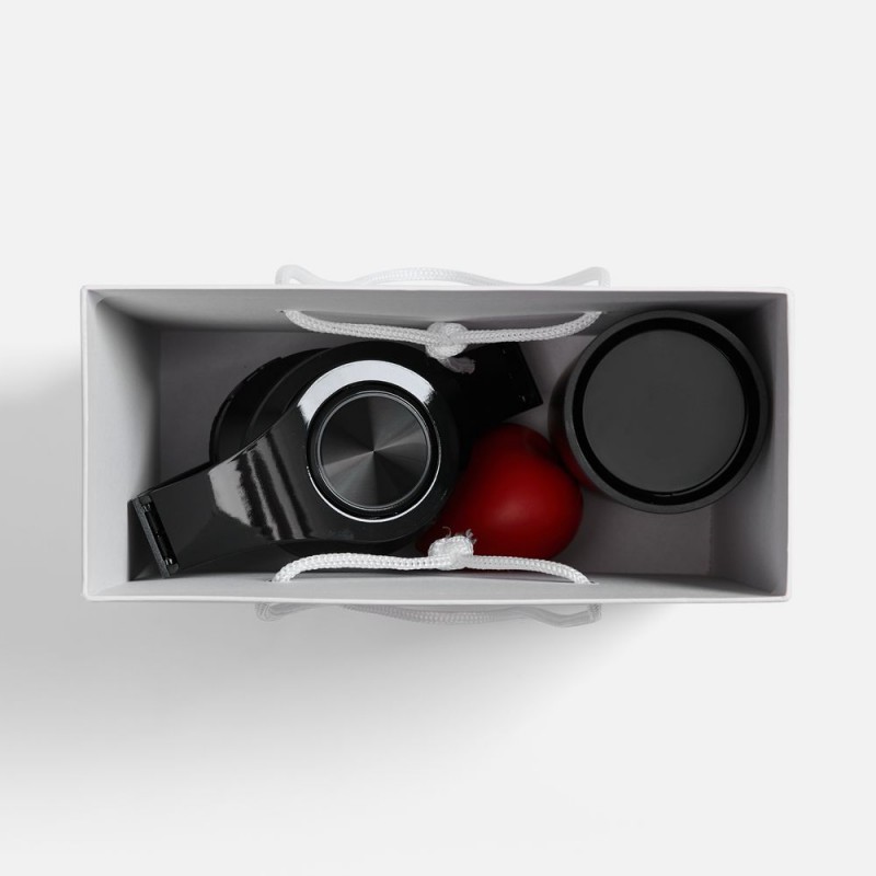 - Материал:наушники - пластик; термостакан - нержавеющая сталь, матовое покрытие; крышка - пластик, силикон; коробка - переплетный картон, бумага Magic; антистресс - вспененный полиуретан