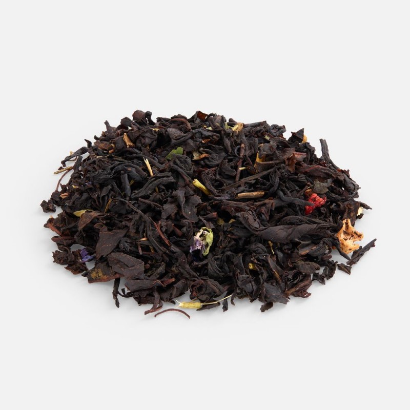 Праздничный купаж на основе черного чая, украшенный цветочными лепестками и кусочками клубники.