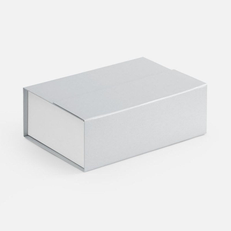 Коробка с клапаном на магните выполнена из переплетного картона, кашированной гладкой дизайнерской бумагой Мalmero двух цветов.