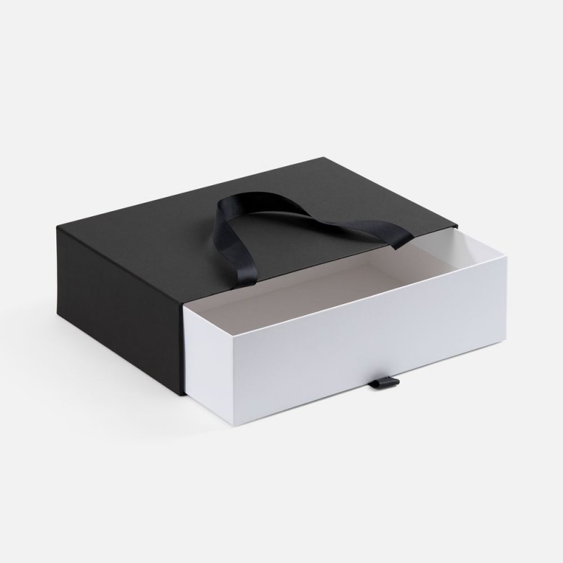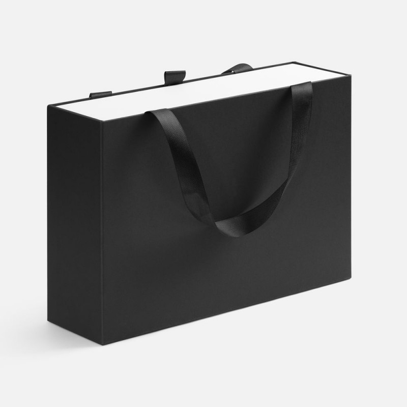 Внешний короб каширован дизайнерской бумаги и оснащен прочными ручками из репсовой ленты. Внутренний короб отделан белой бумагой, ламинированной матовой пленкой.