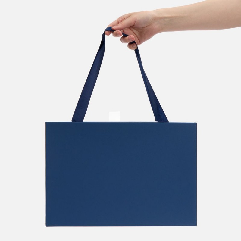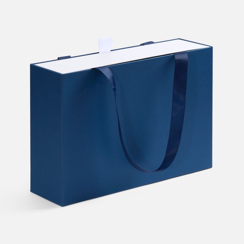 Внешний короб каширован дизайнерской бумаги и оснащен прочными ручками из репсовой ленты. Внутренний короб отделан белой бумагой, ламинированной матовой пленкой.