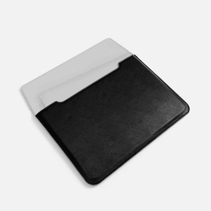 Чехол для ноутбука с диагональю до 15,6 выполнен из материала Petrus, черного цвета, дополнен окрашенным срезом края серого цвета.