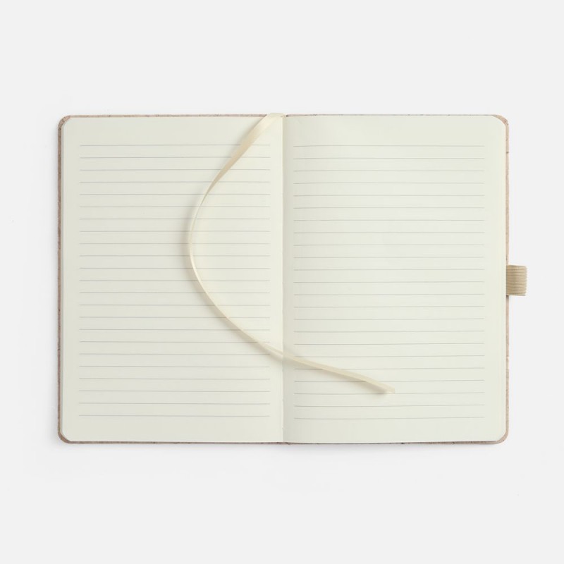 Блокнот с твердой обложкой из натуральной окрашенной пробки, дополнен петлей-резинкой для ручки, ляссе и резинкой в цвет обложки.