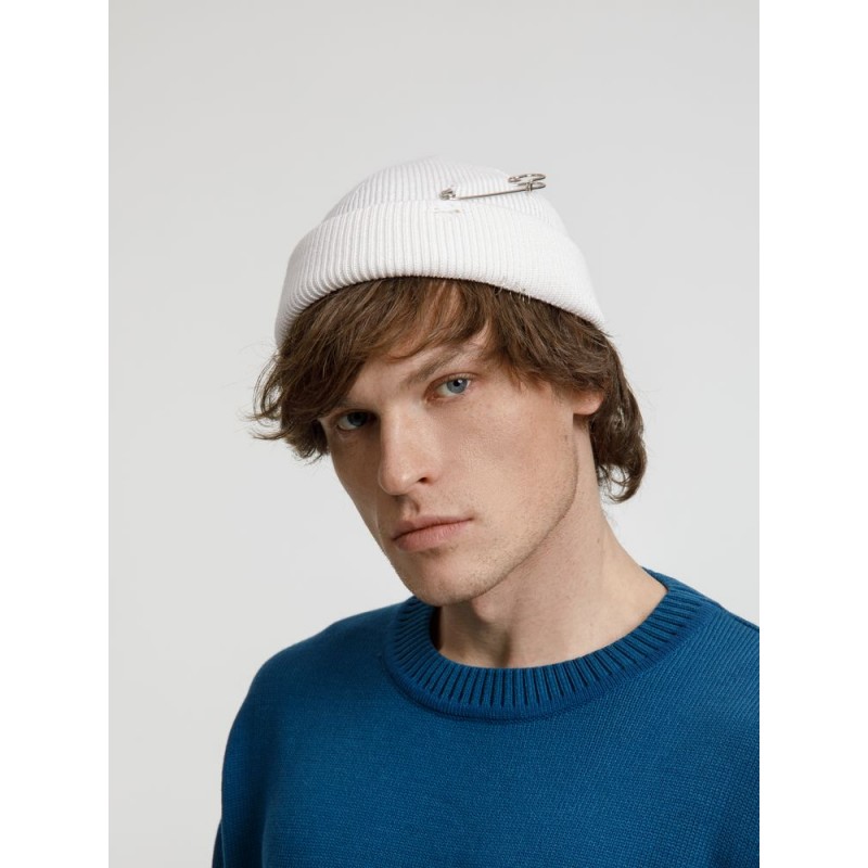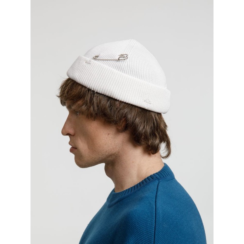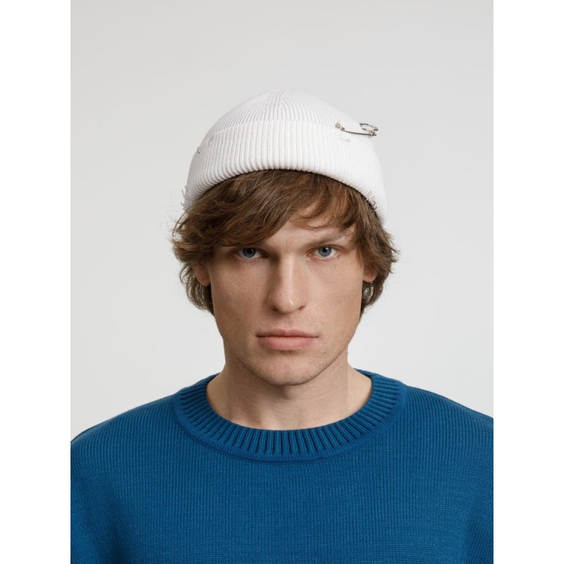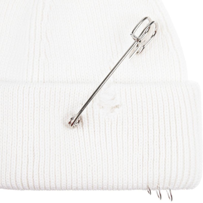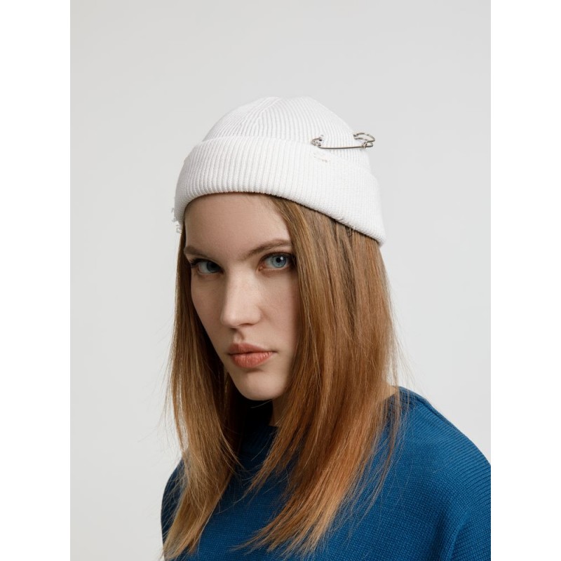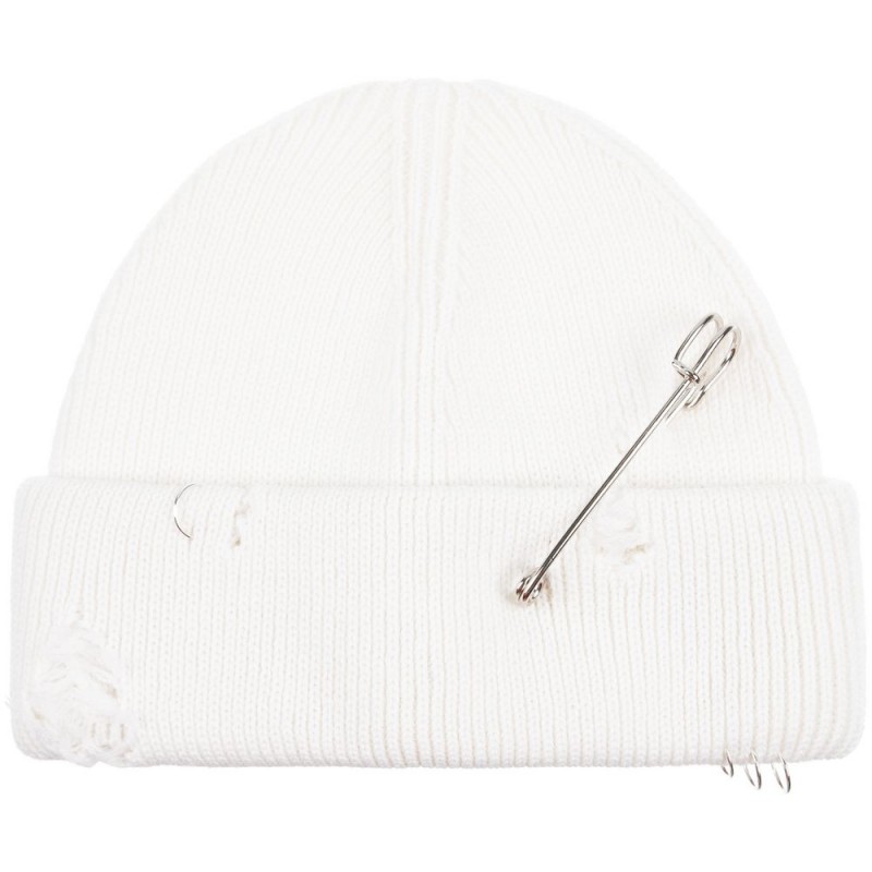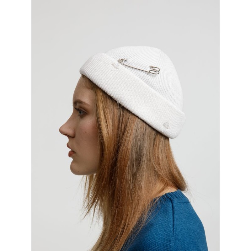 Однослойная шапка бини с рваным отворотом и металлическими аксессуарами для дерзких образов в любом возрасте. Яркий и запоминающийся акцент в стиле гранж.