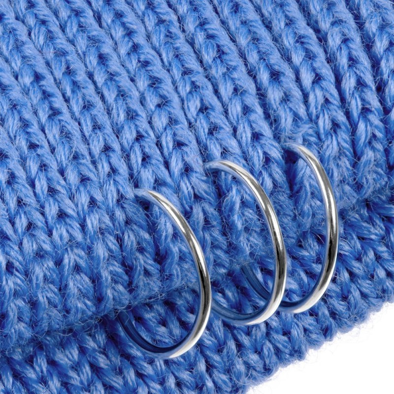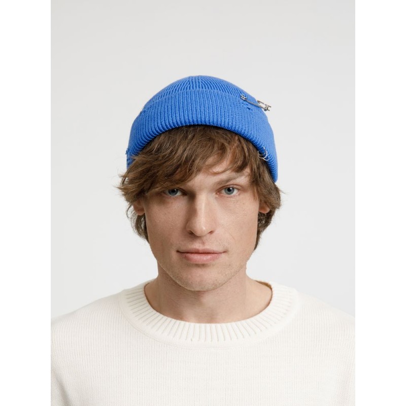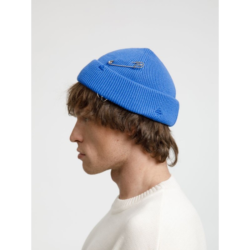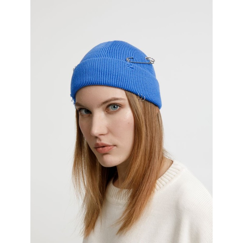 Однослойная шапка бини с рваным отворотом и металлическими аксессуарами для дерзких образов в любом возрасте. Яркий и запоминающийся акцент в стиле гранж.