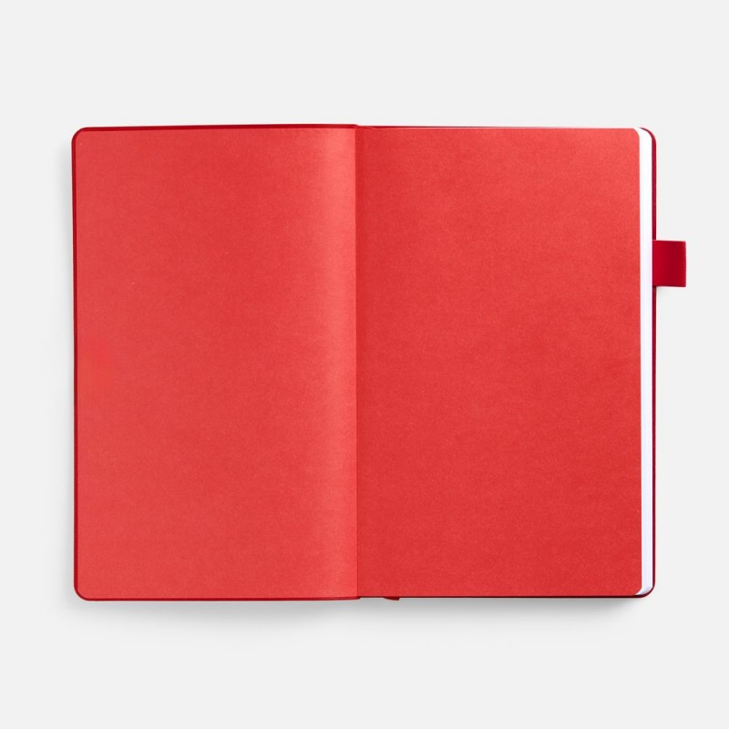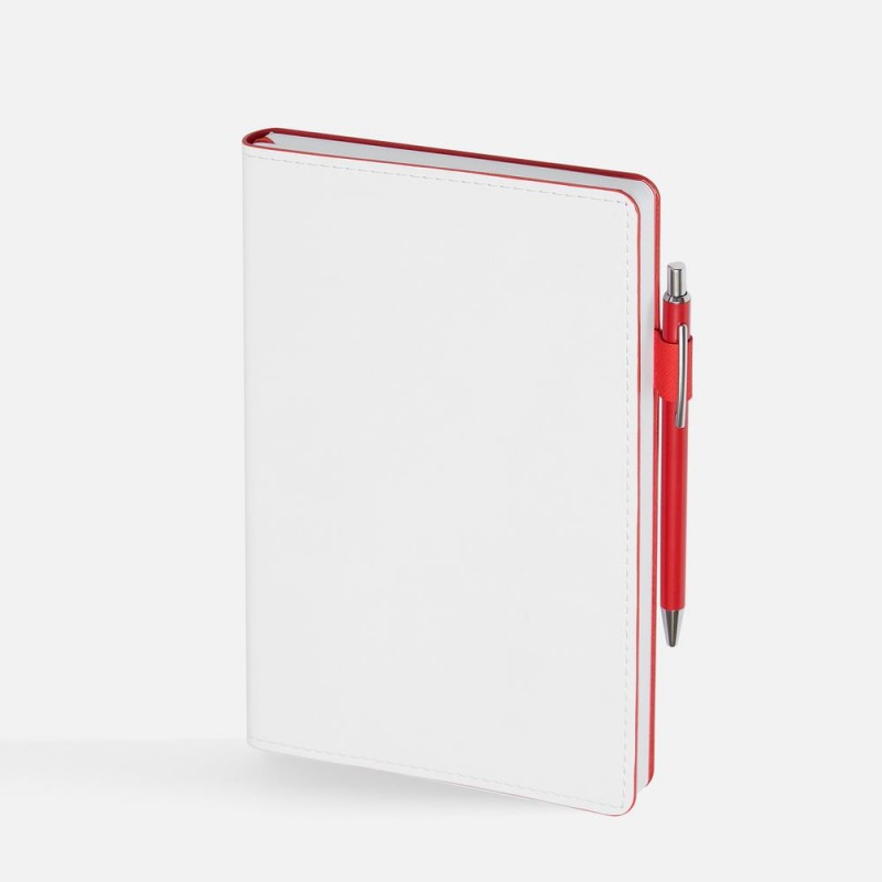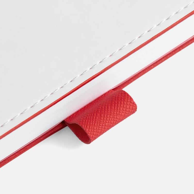 Гибкая обложка, материал обложки — Soft Touch, белый BB; внутренний материал — Latte красный РР; материал петли для ручки — Nice Touch Ultra, красный РР. Срез обложки окрашен в красный цвет.