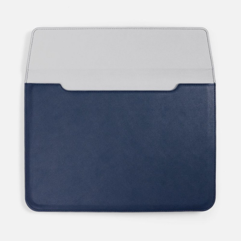Чехол для ноутбука с диагональю до 15,6 выполнен из материала Petrus, синего цвета, дополнен окрашенным срезом края серого цвета.