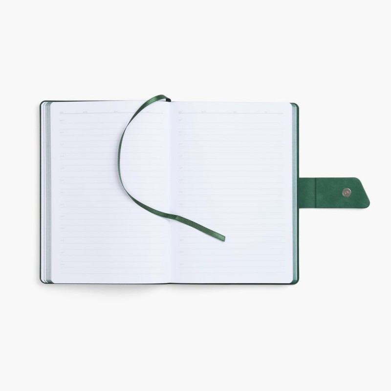 Ежедневник с гибкой обложкой, выполнен из материала La Fite, черный АА и NubuckTouch, зелёный, дополнен зеленым ляссе и хлястиком на кнопке.