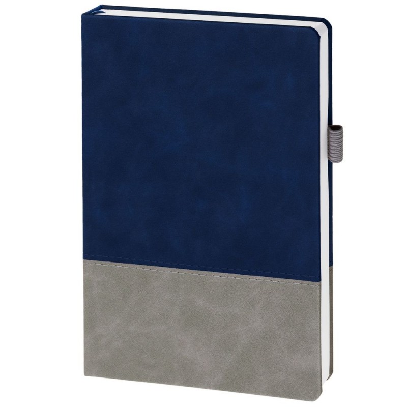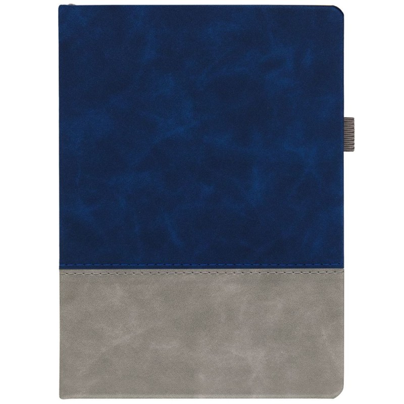 Ежедневник с твердой обложкой, без поролона, со сшивкой материалов Nubuck Touch, серый СС, и Nubuck Touch, темно-синий ХХ, дополнен двойным ляссе и петлей-резинкой для ручки.