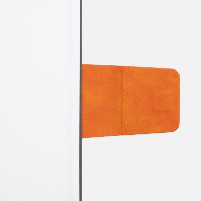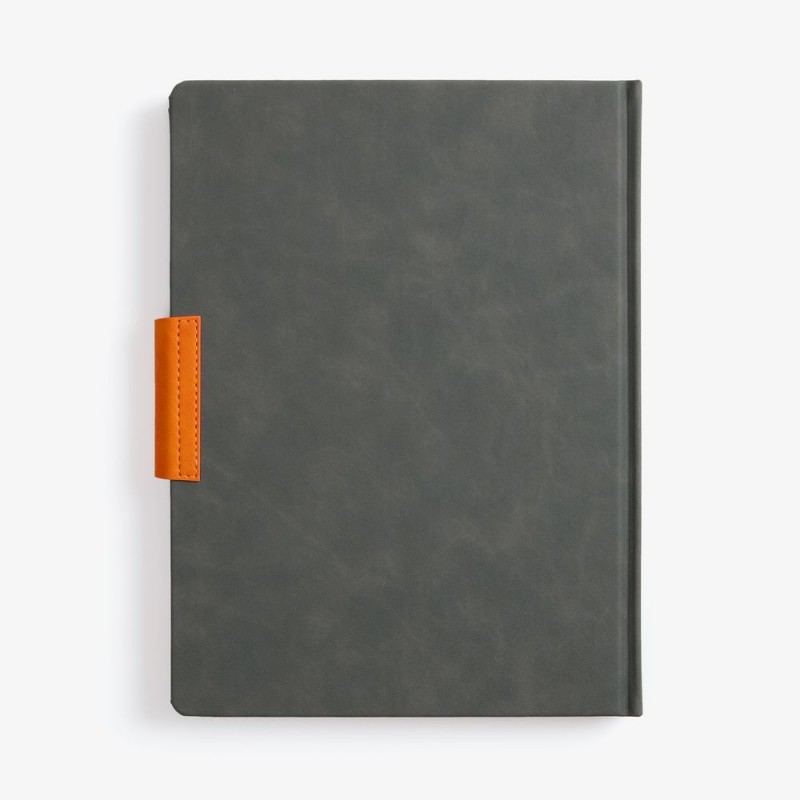 Ежедневник с твердой обложкой, выполнен из материала Nubuck Touch, темно-серый, дополнен капталом, ляссе и обрезом оранжевого цвета. Застежка — хлястик на магните из материала Nubuck Touch Ultra, оранжевый ОО.